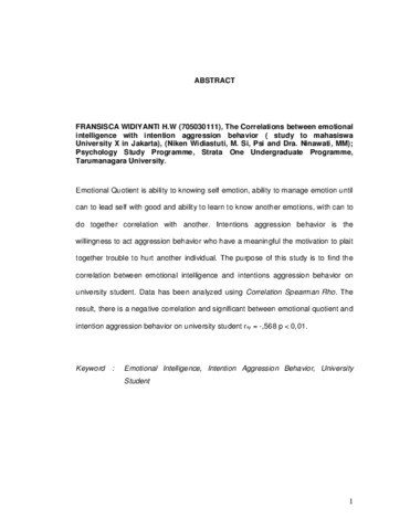Emotional Quotient is ability to knowing self emotion, ability to manage emotion until can to lead self with good and ability to learn to know another emotions, with can to do together correlation with another. Intentions aggression behavior is the willingness to act aggression behavior who have a meaningful the motivation to plait together trouble to hurt another individual. The purpose of this study is to find the correlation between emotional intelligence and intentions aggression behavior on university student. Data has been analyzed using Correlation Spearman Rho. The result, there is a negative correlation and significant between emotional quotient and intention aggression behavior on university student rxy = -,568 p < 0,01.