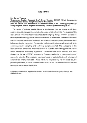 Darwin Yogama, Lim (2016) Penerapan solution-focused brief group therapy (SFBGT) untuk menurunkan perilaku agresi pada emaja yang pernah melakukan tawuran. Masters thesis, Universitas Tarumanagara.