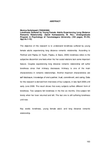The objective of this research is to understand loneliness suffered by young female adults experiencing long distance romantic relationship. According to Perlman and Peplau (in Taylor et al., 2000) loneliness refers to the subjective discomfort one feels when his/ her social relations lack some important feature. Couples experiencing long distance romantic relationship will suffer loneliness since their intimacy decreases. Intimacy is one of the main characteristics in romantic relationships. Another important characteristics are self disclosure, knowledge of one’s partner, trust, commitment, and caring. Data for this research is derived from interviews of four respondents, in late April 2008 until early June 2008. The result shows that every respondent suffers different form of loneliness. Two respondents felt loneliness in the first six months. One respondent felt lonely when her lover returned and left. The last one is still suffering loneliness until now.