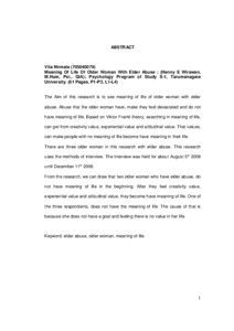 From the research, we can draw that two older woman who have elder abuse, do not have meaning of life in the beginning. After they feel creativity value, experiential value and attitudinal value, they become have meaning of life. One of the three respondents, does not have the meaning of life. The cause of that is because she does not have a goal and feeling there is no value in her life.