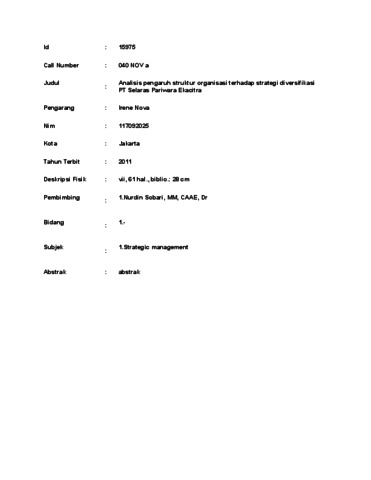 Nova, Irene (2011) nalisis pengaruh struktur organisasi terhadap strategi diversifikasi PT Selaras Pariwara Ekacitra. Masters thesis, UNIVERSITAS TARUMANAGARA.
