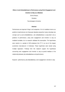 Performance are important things to all companies. A lot of variables known as a predictor of performance, but these past decades researcher trying to develop new concept such as job embeddedness. Job embeddedness is assumed to be a predictor of performance, using work engagement and intention to stay as mediated variables, but no research validated this assumption. The hypotheses were tested on a sample of 305 employee from PT X as one of the largest automotive manufacturer in Indonesia. These hypothesis were tested using multiple regression. Findings from this research support the hypotheses concerning work engagement and intention to stay as partial mediator of the relationship between job embeddedness and performance.