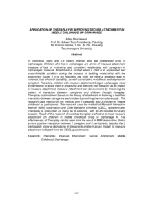 In Indonesia, there are 2.9 million children who are unattended living in orphanages. Children who live in orphanages are at risk of insecure attachment because of lack of mothering and consistent relationship with caregivers in orphanages. Insecure Attachment is formed when a child is in unpleasant and uncomfortable condition during the process of building relationship with the attachment figure. If it is not resolved, the child will have a tendency lead to violence, loss of social capability, as well as indicates moodiness and depression symptom. Therefore, children with insecure attachment living in orphanages need a intervention to assist them in organizing and directing their behavior as an impact of insecure attachment. Insecure Attachment can be overcome by improving the pattern of interaction between caregivers and children through theraplay. Theraplay is a treatment based on the theory of attachment in fostering a healthier interaction between caregivers and children by involving them simultaneously. This research uses method of mix method with 1 caregiver and 3 children in middle childhood as participants. This research uses the method of Marsach Interaction Method (MIM) observation and Child Behavior Checklist (CBCL) questionnaire. Theraplay is conducted as many as 8 sessions, with 30-45 minutes for every session. Result of this research shows that theraplay is effective to lower insecure attachment on children in middle childhood living in orphanage X. The effectiveness of Theraplay can be seen from the result of MIM observation, that is a more positive interaction between 1 caregiver and 3 participants, besides the 3 participants show a decreasing in behavioral problem as an impact of insecure attachment indicated from the CBCL questionnaire.