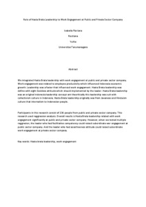 Participants in this research consist of 236 people from public and private sector company. This research used reggression analysis. Overall results is Hasta Brata leadership related with work engagement significantly at public and private sector company. However, when we tested multiple reggresion, the leader who had facilitative competency could raised subordinate wor engagement at public sector company. And the leader who had assertiveness attitude could raised subordinate work engagement at private sector company.