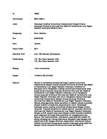Mustika., Dew (2011) Hubungan Kualitas Komunikasi Interpersonal Dengan Kinerja Karyawan Direktorat Informasi Dan Media Di Kementerian Luar Negeri Republik Indonesia./Mustika Dewi. Skripsi thesis, UNIVERSITAS TARUMANAGARA.