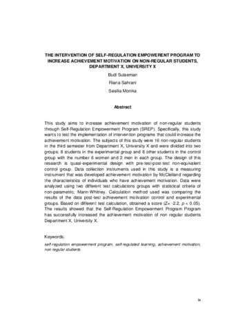 Sulaeman, Budi (2017) THE INTERVENTION OF SELF-REGULATION EMPOWERENT PROGRAM TO INCREASE ACHIEVEMENT MOTIVATION ON NON-REGULAR STUDENTS, DEPARTMENT X, UNIVERSITY X. Masters thesis, Universitas Tarumanagara.
