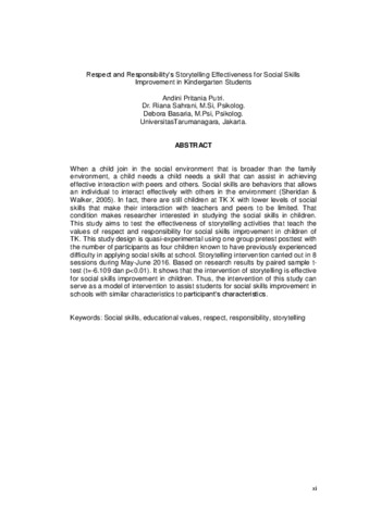 Putri, Andini Pritani (2016) "Efektivitas mendongeng tentang respek dan tanggung jawab dalam meningkatkan keterapilan sosial anak (Studi pada siswa taman kanak-kanak X Rawamangun) ". Masters thesis, Universitas Tarumanagara.