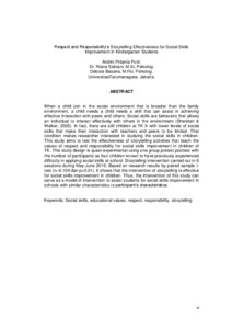 When a child join in the social environment that is broader than the family environment, a child needs a child needs a skill that can assist in achieving effective interaction with peers and others. Social skills are behaviors that allows an individual to interact effectively with others in the environment (Sheridan & Walker, 2005). In fact, there are still children at TK X with lower levels of social skills that make their interaction with teachers and peers to be limited. That condition makes researcher interested in studying the social skills in children. This study aims to test the effectiveness of storytelling activities that teach the values of respect and responsibility for social skills improvement in children of TK. This study design is quasi-experimental using one group pretest posttest with the number of participants as four children known to have previously experienced difficulty in applying social skills at school. Storytelling intervention carried out in 8 sessions during May-June 2016. Based on research results by paired sample t-test (t=-6.109 dan p<0.01). It shows that the intervention of storytelling is effective for social skills improvement in children. Thus, the intervention of this study can serve as a model of intervention to assist students for social skills improvement in schools with similar characteristics to participant’s characteristics.