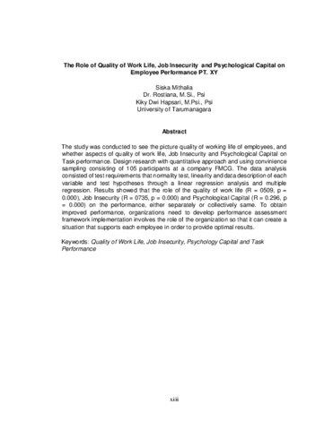 Mithalia, Siska (2017) Peran kualitas kehidupan kerja, rasa tidak aman bekerja dan modal psikologis terhadap kinerja karyawan (Studi Pada PT. XY). Masters thesis, Universitas Tarumanagara.
