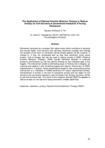 Retirement assumed as a process that raises stress which contribute to physical and mental health. Civil servants who will face retirement consider that change the situation of the work on retirement will be threats against his life currently. A change in, if they not anticipated well as they face retirement could cause anxiety. One of therapy that can be used to reduce anxiety is REBT (Rational Emotive Behavior Therapy). REBT handle individual disorder in evaluate emotions and behavior by use the rational thinking so that individual able to live happily. The intervention aimed at eliminating ways of thinking that is illogical, an irrational and replace it with something logical and rational. Intervention of REBT implemented in 7 session. Quasi-experimental research was conducted by giving intervention to 2 individual in middle adulthood (57 years) experienced anxiety. Characteristic of anxiety in the form of symptoms anxiety with the object of civil servants who are facing retirement uses the State-Trait Anxiety Inventory (STAI) as pre-test and post-test. The result of this research showed REBT be applied to reduce anxiety on civil servants facing retirement (middle adulthood)