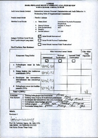Hendro Lukman,S.E., M.M, Ak., CPMA., CA, CPA (Aust.) CSRS, peer review (2017) Peer Review 03 Hendro Lukman,S.E., M.M, Ak., CPMA., CA, CPA (Aust.) CSRS. Review : Interactions between Personal Characteristics and Audit Behavior: A Moderating Role of Organizational Commitment, 11 (3). pp. 337-345. ISSN 1307-1637