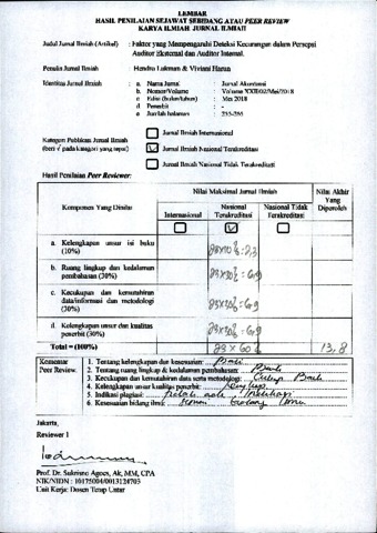 Hendro Lukman, peer review and Viviani Harun, peer review (2018) Peer Review 07 Hendro Lukman,S.E., M.M, Ak., CPMA., CA, CPA (Aust.) CSRS & Viviani Harun. Review : Faktor yang Mempengaruhi Deteksi Kecurangan dalam Persepsi Auditor Eksternal dan Auditor Internal., XXII (2). pp. 255-265. ISSN 1410-3591