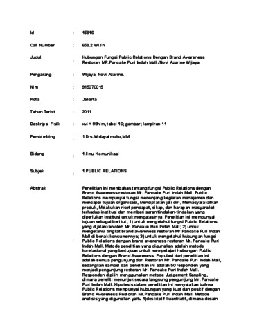 Novi Azarine., Wijaya (2011) Hubungan Fungsi Public Relations Dengan Brand Awareness Restoran MR.Pancake Puri Indah Mall./Novi Azarine Wijaya. Skripsi thesis, UNIVERSITAS TARUMANAGARA.