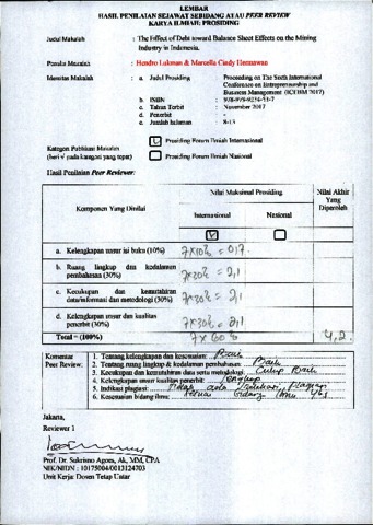 Hendro Lukman,S.E., M.M, Ak., CPMA., CA, CPA (Aust.) CSRS, peer review and Marcella Cindy Hermawan, peer review (2017) Peer Review 11 Hendro Lukman,S.E., M.M, Ak., CPMA., CA, CPA (Aust.) CSRS & Marcella Cindy Hermawan. Review : The Effect of Debt toward Balance Sheet Effects on the Mining Industry in Indonesia.. pp. 8-13. ISSN 2598-7976
