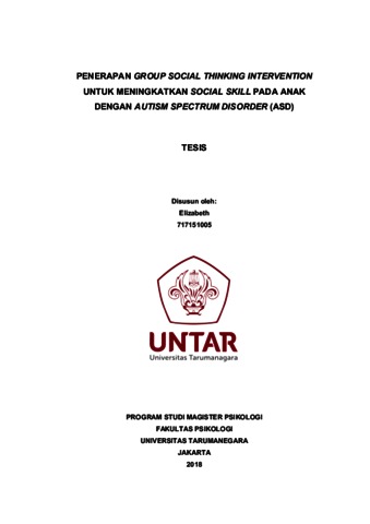 Elizabeth, E (2018) Penerapan Group Social Thinking Intervention untuk Meningkatkan Social Skill Pada Anak dengan Autism Spectrum Disorder (ASD). Masters thesis, Universitas Tarumanagara.