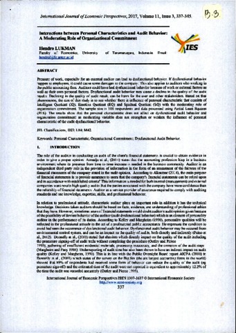 Hendro Lukman,S.E., M.M, Ak., CPMA., CA, CPA (Aust.) CSRS, peer review (2017) Review Doc.03 Hendro Lukman,S.E., M.M, Ak., CPMA., CA, CPA (Aust.) CSRS. Doc. Interactions between Personal Characteristics and Audit Behavior: A Moderating Role of Organizational Commitment, 11 (3). pp. 337-345. ISSN 1307-1637