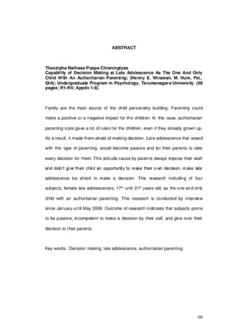 Nathasa Puspa Citraningtyas, Theozipha (2010) Kemampuan Decision Making Remaja Akhir Putri Sebagai Anak Tunggal Yang Mengalami Pola Pengasuhan Ototriter. Skripsi thesis, Universitas Tarumanagara.
