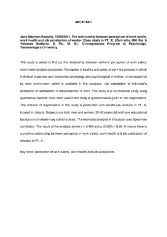Maureen Kasidy, Jane (2010) Hubungan Antara Persepsi Terhadap Keselamatan Dan Kesehatan Kerja Dengan Kepuasan Kerja Pada Pekerja (Studi Pada PT. X). Skripsi thesis, Universitas Tarumanagara.