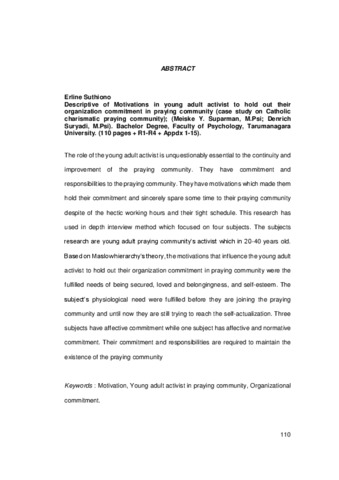 The role of the young adult activist is unquestionably essential to the continuity and improvement of the praying community. They have commitment and responsibilities to the praying community. They have motivations which made them hold their commitment and sincerely spare some time to their praying community despite of the hectic working hours and their tight schedule. This research has used in depth interview method which focused on four subjects. The subjects research are young adult praying community’s activist which in 20-40 years old. Based on Maslow hierarchy’s theory, the motivations that influence the young adult activist to hold out their organization commitment in praying community were the fulfilled needs of being secured, loved and belongingness, and self-esteem. The subject’s physiological need were fulfilled before they are joining the praying community and until now they are still trying to reach the self-actualization. Three subjects have affective commitment while one subject has affective and normative commitment. Their commitment and responsibilities are required to maintain the existence of the praying community