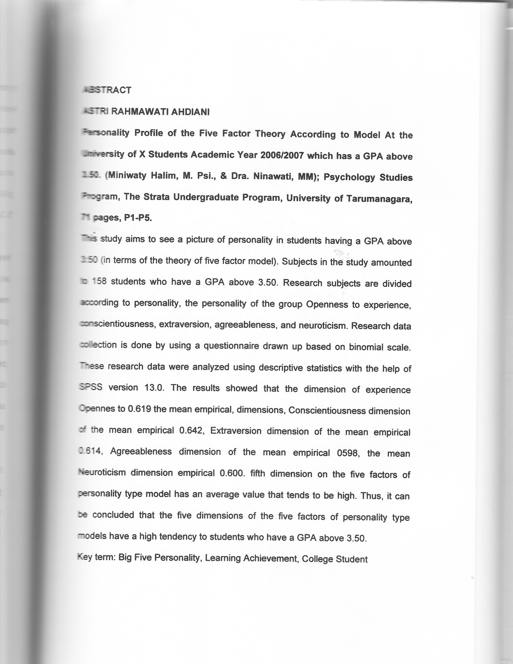 rahmawati Ahdiani, Astri (2009) Profil kepribadian menurut teori five factor model pada mahasiswa universitas x tahun akademik 2006/2007 yang memiliki IPK di atas 3.50. Skripsi thesis, Universitas Tarumanagara.