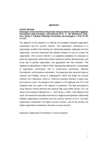 The objective of this research is to identify the correlation between organization commitment and the turnover intention. The organization commitment is a psychologic condition that showing the relationship between employee and their organization, and also influencing their decision whether to stay or to leave the organization. The turnover intention is a subjective probability for employee to leave the organization where they worked, looking for another alternative jobs, and move over to another organization, that appropriate with their confiction. This research is using Meyer & Allen’s (1991) theories that defined the 3 components of organization commitment, that is: Continuance commitment, Affective Commitment, and Normative commitment. The researcher also using the theory of intention from Mobley, Horner & Hollingsworth (1978) that divide the turnover intention into 3 dimension, which is: Thinking of quitting, Intention to search job, and intention to quit. The sample of this research is 78 employee from PT.X, the analytical tools that used in this research is questioner. The data processing is using Pearson Product Moment with optional help using SPSS version 12.0. the result of this research indicates that r = -0.873 and p = 0.000 < 0,05. Based on the result, the researcher concludes that there is a negative and significant relationship between organization commitment and the turnover intention at PT.X. the lower organization commitment, the higher turnover intention, and on the contrary, the higher organization commitment, the lower turnover intention.