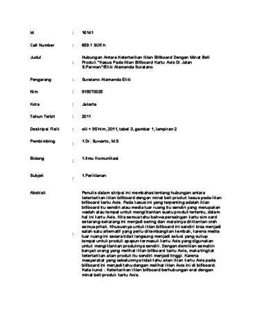 lamanda Ekki, Suratano (2011) ubungan Antara Ketertarikan Iklan Billboard Dengan Minat Beli Produk "Kasus Pada Iklan Billboard Kartu Axis Di Jalan S.Parman"/Ekki Alamanda Suratano. Skripsi thesis, UNIVERSITAS TARUMANAGARA.