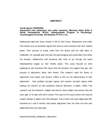 Adolescents deal with many choices in life for their future. Adolescents who suffer from illness such as leukemia regard their lives as more stressful than their healthy peers. Their sources of stress come from the illness and the side effect of medication, for example pain and also the psychological and social effect that follow the process. Adolescents with leukemia also have to go through the same developmental stages as their healthy peers. This study focused on what adolescents with leukemia think about their life situation, the support they get, and process of adjustment about their illness. This research used the theory of adjustment from Haber and Runyon (1984) to find out the effectiveness of their adjustment , their problem focused coping and emotion focused coping while seeking the solution for their problems (Nietzel, Bernstein, & Milich, 1998). This research use the method of indepth interview for three subject (two women and one man) age 12-15 year who still in school. The result of this study shows that three all subject attempt to adjust from their illnesses. Two of them who were diagnosed with leukemia for 4 and 9 months have better adjustment than the other one who was diagnosed since two years ago.