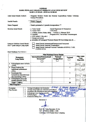Agus Zainul Arifin, peer review (2010) Review 9 Agus Zainul Arifin. Review : Pengaruh Struktur Modal dan Struktur Kepemilikan Saham Terhadap Kinerja Perusahaan., III (I). pp. 11-28. ISSN 1410-4415
