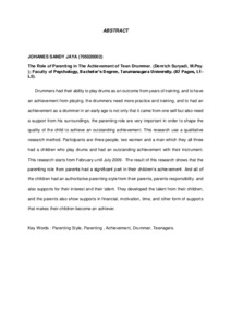 Drummers had their ability to play drums as an outcome from years of training, and to have an achievement from playing, the drummers need more practice and training, and to had an achievement as a drummer in an early age is not only that it came from one self but also need a support from his surroundings, the parenting role are very important in order to shape the quality of the child to achieve an outstanding achievement. This research use a qualitative research method. Participants are three people, two women and a man which they all three had a children who play drums and had an outstanding achievement with their instrument. This research starts from February until July 2009. The result of this research shows that the parenting role from parents had a significant part in their children’s achievement. And all of the children had an authoritative parenting style from their parents, parents responsibility and also supports for their interest and their talent. They developed the talent from their children, and the parents also show supports in financial, motivation, time, and other form of supports that makes their children become an achiever.