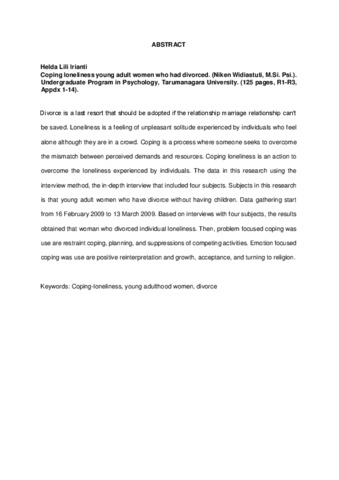 Divorce is a last resort that should be adopted if the relationship marriage relationship can’t be saved. Loneliness is a feeling of unpleasant solitude experienced by individuals who feel alone although they are in a crowd. Coping is a process where someone seeks to overcome the mismatch between perceived demands and resources. Coping loneliness is an action to overcome the loneliness experienced by individuals. The data in this research using the interview method, the in-depth interview that included four subjects. Subjects in this research is that young adult women who have divorce without having children. Data gathering start from 16 February 2009 to 13 March 2009. Based on interviews with four subjects, the results obtained that woman who divorced individual loneliness. Then, problem focused coping was use are restraint coping, planning, and suppressions of competing activities. Emotion focused coping was use are positive reinterpretation and growth, acceptance, and turning to religion.