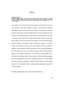 This research is to know the role of social support for early adult women who were abused in their dating violence. Abuses in dating could be physical, psychological, sexual, and economical that consists of mental pressure, physical pressure, sexual abuse, and psychological abuse. One of the supports that could be given to these abused victims is social support. Social support can be given by having someone that can be trusted and will always be there to give hand when needed. There are five kinds of social support, which are esteem support, emotional support, instrumental support, information support, and network support. This research has used a face to face interview method to wards five subjects. These participant include individuals that have an age range between 22 to 28 years old who got an experience as abused victims in dating violence. Based on the research conducted, I can conclude that social support has a significant role to abused victims in dating violence. The most significant support that the five participants got was from families and friends. The social support that they received was equivalent to what they have needed. The most needed supports for these abused victims in dating violence are esteem support and emotional support.