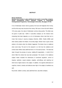 A lot of Indonesian citizen tried to guaranty the future with deposite their money, and the other way was insurance their money. We have to know that with inflation 10% every years, the value of Indonesian currency drop quickly. The effect was the growt of yield was 1.520% in securities company so the interest more interesting than bank deposite, so a lot of Indonesian citizen tried their luck to invest their money in security company (Dominic, 2008). Charlie (2006) said when broker predict the inflation, the anxiety begun. Broker have to give correct advise to the clients when the inflation happened. The broker have to resilience when stock drop. The aim for this research is to find how the resilience and anxiety factor effects early adulthood man on in the security factor. The data was taken through the process of survey, totalling 58 respondents, in which 50 of whom filled the criteria that was later processed. The results in the resilience subject matter included the dimensions of emotional regulation, control of impulse, optimism, causal analysis, empathy, self-efficacy and reaching out which led to higher levels to the subject. In addition, the cognitive dimensions of cognitive, motoric, somatic and affective were high in the subject of resilience as well.