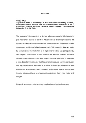 Daud, Veisu (2009) Gambaran penyesuaian diri penyandang tuna netra fase post natal akibat kecelakaan (studi kasus sepasang suami istri). Skripsi thesis, Universitas Tarumanagara.