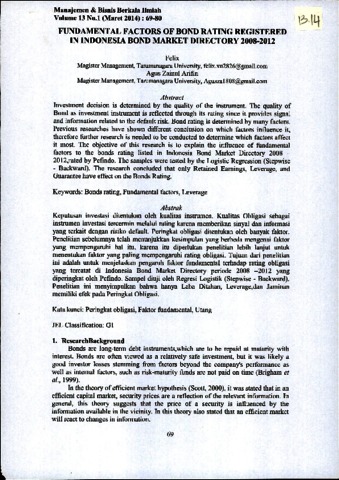 Felix, doc.jurnal and Agus Zainul Arifin, doc.jurnal (2014) Doc.14 Felix, Agus Zainul Arifin. Doc : Fundamental Factors Of Bond Rating Registered In Indonesia Bond Market Directory 2008-2012., 13 (1). pp. 69-80. ISSN 1412-3789