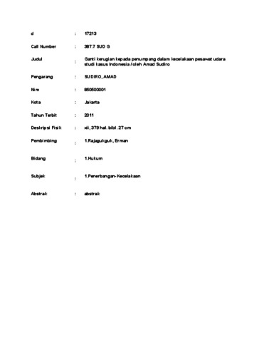 AMAD, SUDIRO (2011) Ganti kerugian kepada penumpang dalam kecelakaan pesawat udara studi kasus Indonesia / oleh Amad Sudiro. Doctoral thesis, UNIVERSITAS TARUMANAGARA.