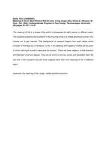 The meaning of life is a unique thing which is possessed by each person in different ways. This research presents the illustration of the meaning of life in a middle adulthood woman who choose not to get married. This background of research begins from east values which consider a marriage as a mandatory of life, if not labelling and negative minded will be given to whom didn’t get married, especially the woman. There are three subjects in this research with bachelor minimum degree. They are all works in service, social, and education field. We can see in this research that the three subjects have their own meaning of life in different ways.