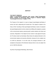 The Purpose of this research is to get an image of psychological well-being of women who had a relationship with married man. This research is based on the theory of Ryff. According to Ryff, psychological well-being is results of evaluation dan psychological positive function someone by fulfilling self-acceptance, purpose of life, environmental mastery, personal growth, positive relations with others and autonomy. Responden in this research are four women in early ages 22-33 years old. The data is taken by interviewing. Result shows the weakest dimension is the environmental mastery and autonomy dimension, because the four subjects can not fulfill thus dimension. In the other hand, the strongest dimension is self-acceptance and purpose of life dimension because there is only one subject that can not fulfill this dimension.