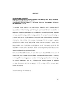 "The purpose of this research is to reveal intimacy (Bagarozzi, 2001) difference among spouses based on their marriage age. Intimacy is dynamic and interactive process that is based upon mutual trust and respect. The marriage age is grouped into four types: newlywed marriage, parental marriage, mid-life marriage, and later-life marriage. Newlywed marriage is a spouse which just got married and hasn’t got any first child. Parental marriage is a spouse who has first child until their child grows up into teenager. Mid-life marriage is a spouse whose child or children leaving their parents’ house. Later-life marriage is a spouse which become elders, have grandchild or grandchildren, or retired. This research consist of 384 respondent men and women who live in Jakarta representing marriage age category. This research using accidental sampling technique.