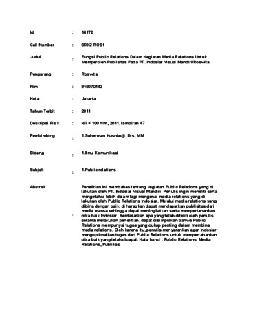 Roswita, Roswita (2011) ungsi Public Relations Dalam Kegiatan Media Relations Untuk Memperoleh Publisitas Pada PT. Indosiar Visual Mandiri/Roswita. Skripsi thesis, UNIVERSITAS TARUMANAGARA.