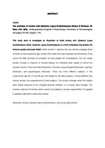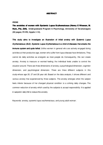 This study aims to investigate an illustration of initial anxiety with Systemic Lupus Erythematosus (SLE). Systemic Lupus Erythematosus is a kind of diseases that attacks the immune system and quite lethal. Unlike women in general who are actively engaged doing activities at their productive age, women who suffer from lupus disease have limitations. They cannot do daily activities as energetic as most people do. Consequently, this can create anxiety. Anxiety is insecure or worried feeling; the individual feels unable to control the situation around. There are three dimensions of anxiety; a psychological dimension, cognition dimension, and psychological dimension. There are three different subjects in this study whose age 20, 27 and 28 year old. Based on the data analysis, it shows different and various anxiety that experienced by three subjects. The anxiety emerges when the subject feels inferior because of her changed physical condition to a striking daily changes. The common reduction of anxiety which used by the subjects is accept responsibility. It is applied in subjects’ daily life to reduce the anxiety.