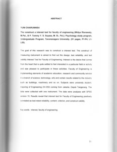 The goal of this research was to construct a interest test. The construct of measuring instrument is aimed to find out the design, test reliability, and test validity Interest Test for Faculty of Engineering. Interest is the desire that comes from the heart that is quite settled to feel interested in a particular field or activity and was pleased to participate in these activities. Faculty of Engineering is mplementing elements of academic education, research and community service n a branch of science, technology, arts and certain results related to the industry such as buildings, machinery and so on. Subjects were university student. majoring of Engineering (N=250) coming from Jakarta, Depok Tangerang. The data were collected with one instrument. The data were analyses with SPSS ersion 15. Results reveal that interest test for Faculty of Engineering positively correlated as test-retest reliability, content, criterion, and construct validity.