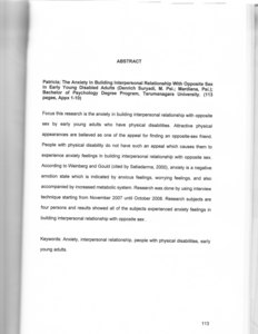 Patricia, Patricia (2009) Kecemasan dalam menjalin hubungan interpersonal dengan lawan jenis pada penyandang tuna daksa cacat tubuh dewasa awal. Skripsi thesis, Universitas Tarumanagara.