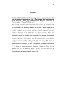 This research was aimed to know the relationship between job satisfaction with job performance. Job satisfaction refers to an individual’s attitude toward his or her job. Job performance refers to quantity and quality expected from each employee. Concepts of job satisfaction were based exchange theory and discrepancy theory, and concepts of job performance are gathered from company resource. Samples of this research were 72 employee, taken from population using convenience sampling technique. The data were analyzed by means of Rank Spearman Technique. The data is collected by spreading questioners at PT. X. Based on analyzing data with Statistical Program for Social Science (SPSS) versi 15.0 for Windows, there is positive correlation between job satisfaction with job performance (r=0.349, p<0.05).