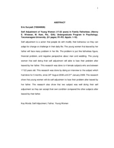 Self adjustment is a action that people do with modify their behaviour so they can adapt for change or challenge in their daily life. The young women that leaved by her father will face many problem in her life. The problem is just like fatherless figure, financial problem, and negative perspective about man and wedding. The young women that well doing their self adjustment will able to face their problem after leaved by her father. This research was done to 4 female subjects who are between 17-22 years old. This research was done by doing an interview to the subject which had done for 5 months, since 24th August 2008 until 21th January 2009. The research show that young women wiil do self adjustment to face their problem after leaved by her father. The reseacrh also show that two subject was well doing their self adjustment so they can accept their own condition compared the other subjects after leaved by their father.