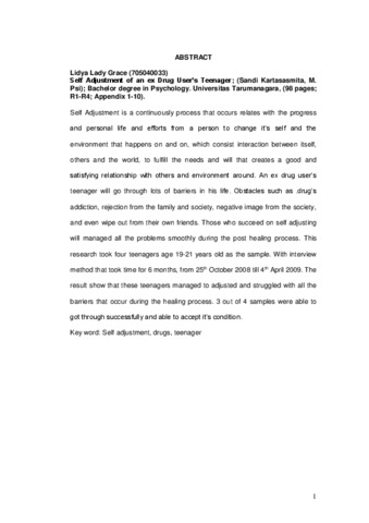 Self Adjustment is a continuously process that occurs relates with the progress and personal life and efforts from a person to change it’s self and the environment that happens on and on, which consist interaction between itself, others and the world, to fulfill the needs and will that creates a good and satisfying relationship with others and environment around. An ex drug user’s teenager will go through lots of barriers in his life. Obstacles such as .drug’s addiction, rejection from the family and society, negative image from the society, and even wipe out from their own friends. Those who succeed on self adjusting will managed all the problems smoothly during the post healing process. This research took four teenagers age 19-21 years old as the sample. With interview method that took time for 6 months, from 25th October 2008 till 4th April 2009. The result show that these teenagers managed to adjusted and struggled with all the barriers that occur during the healing process. 3 out of 4 samples were able to got through successfully and able to accept it’s condition.