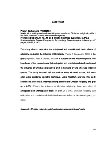 Soeharsono, Pratiwi (2010) Moderasi kematian terantisipasi dan tidak terantisipasi terhadap pengaruh religiusitas kristiani pada dukacita suami atau istri yang ditinggal mati pasangan. Skripsi thesis, universitas Tarumanagara.