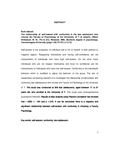 Idawati, Ruth (2010) Hubungan Self Esteem dengan Konformitas pada Remaja Akhir yang Memiliki Fakultas Psikologi pada Universitas T di Jakarta. Skripsi thesis, universitas Tarumanagara.