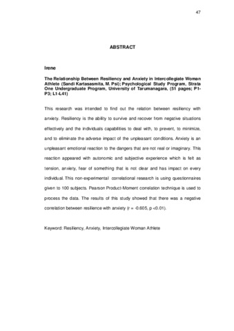 This research was intended to find out the relation between resiliency with anxiety. Resiliency is the ability to survive and recover from negative situations effectively and the individuals capabilities to deal with, to prevent, to minimize, and to eliminate the adverse impact of the unpleasant conditions. Anxiety is an unpleasant emotional reaction to the dangers that are not real or imaginary. This reaction appeared with autonomic and subjective experience which is felt as tension, anxiety, fear of something that is not clear and has impact on every individual. This non-experimental correlational research is using questionnaires given to 100 subjects. Pearson Product-Moment correlation technique is used to process the data. The results of this study showed that there was a negative correlation between resilience with anxiety (r = -0.605, p <0.01).