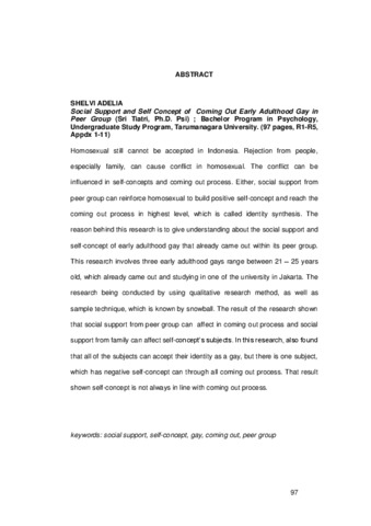Homosexual still cannot be accepted in Indonesia. Rejection from people, especially family, can cause conflict in homosexual. The conflict can be influenced in self-concepts and coming out process. Either, social support from peer group can reinforce homosexual to build positive self-concept and reach the coming out process in highest level, which is called identity synthesis. The reason behind this research is to give understanding about the social support and self-concept of early adulthood gay that already came out within its peer group. This research involves three early adulthood gays range between 21 – 25 years old, which already came out and studying in one of the university in Jakarta. The research being conducted by using qualitative research method, as well as sample technique, which is known by snowball. The result of the research shown that social support from peer group can affect in coming out process and social support from family can affect self-concept’s subjects. In this research, also found that all of the subjects can accept their identity as a gay, but there is one subject, which has negative self-concept can through all coming out process. That result shown self-concept is not always in line with coming out process.