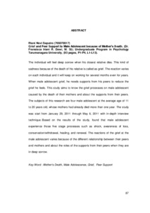 The individual will feel deep sorrow when his closest relative dies. This kind of sadness because of the death of his relative is called as grief. The reaction varies on each individual and it will keep on working for several months even for years. When male adolescent grief, he needs supports from his peers to reduce the grief he feels. This study aims to know the grief processes on male adolescent caused by the death of their mothers and about the supports from their peers. The subjects of this research are four male adolescent at the average age of 11 to 20 years old, whose mothers had already died more than one year. The study was start from January 29, 2011 through May 6, 2011 with in-depth interview technique. Based on the results of the study, found that male adolescent experience those five stage processes such as shock, awareness of loss, conservation/withdrawal, healing, and renewal. The reactions of the grief at the male adolescent varies because of the different relationship between their peers and mothers and about the roles of the supports from their peers when they are in deep sorrow.